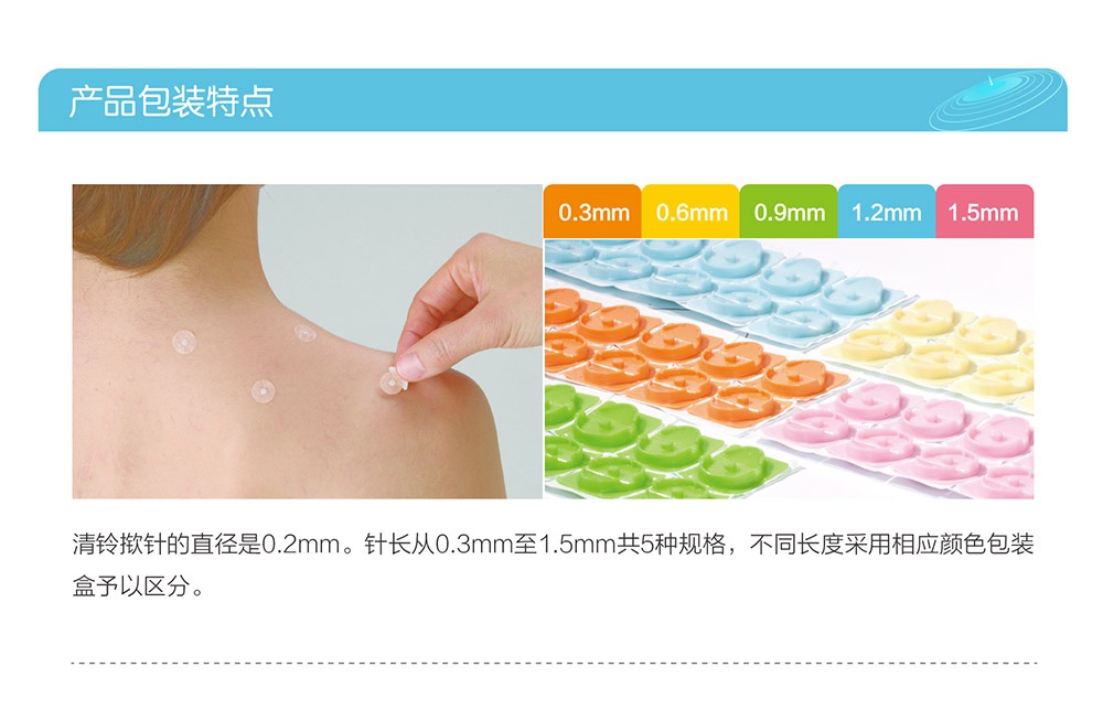 撳針是一種創(chuàng)新型皮內針,具有安全,方便,舒適,無創(chuàng)痛等特點。2002年開始研發(fā),2004年正式在日本上市。撳針直徑均為0.2mm。針長從0.3mm至1.5mm共五種規(guī)格。按照日本QMS(醫(yī)療器械生產質量管理體系)生產。獲得美國FDA認證,歐洲CE認證,SFDA認證及ISO13485質量體系認證。
